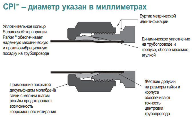 Фитинги трубопроводов КИП корпорации Рarker поставляются в полностью собранном виде и готовы к применению. Уплотнительная втулка (втулки) обжимает