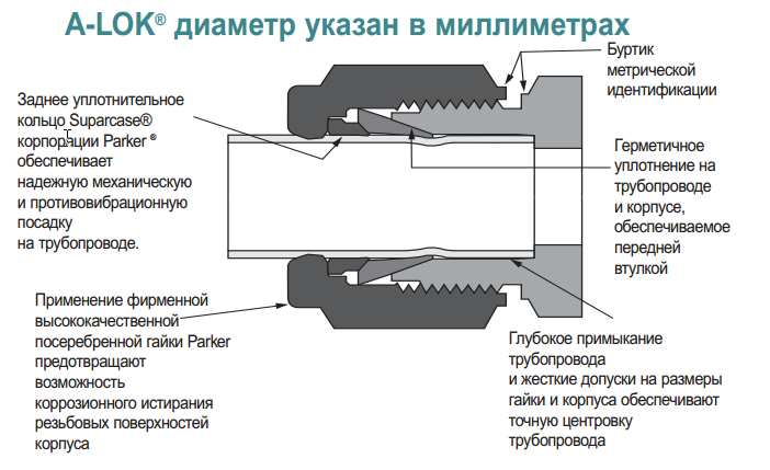 корпорации Parker (задняя втулка устанавливается только на фитингах A-LOK) обеспечивает надежную механическую посадку на трубе.